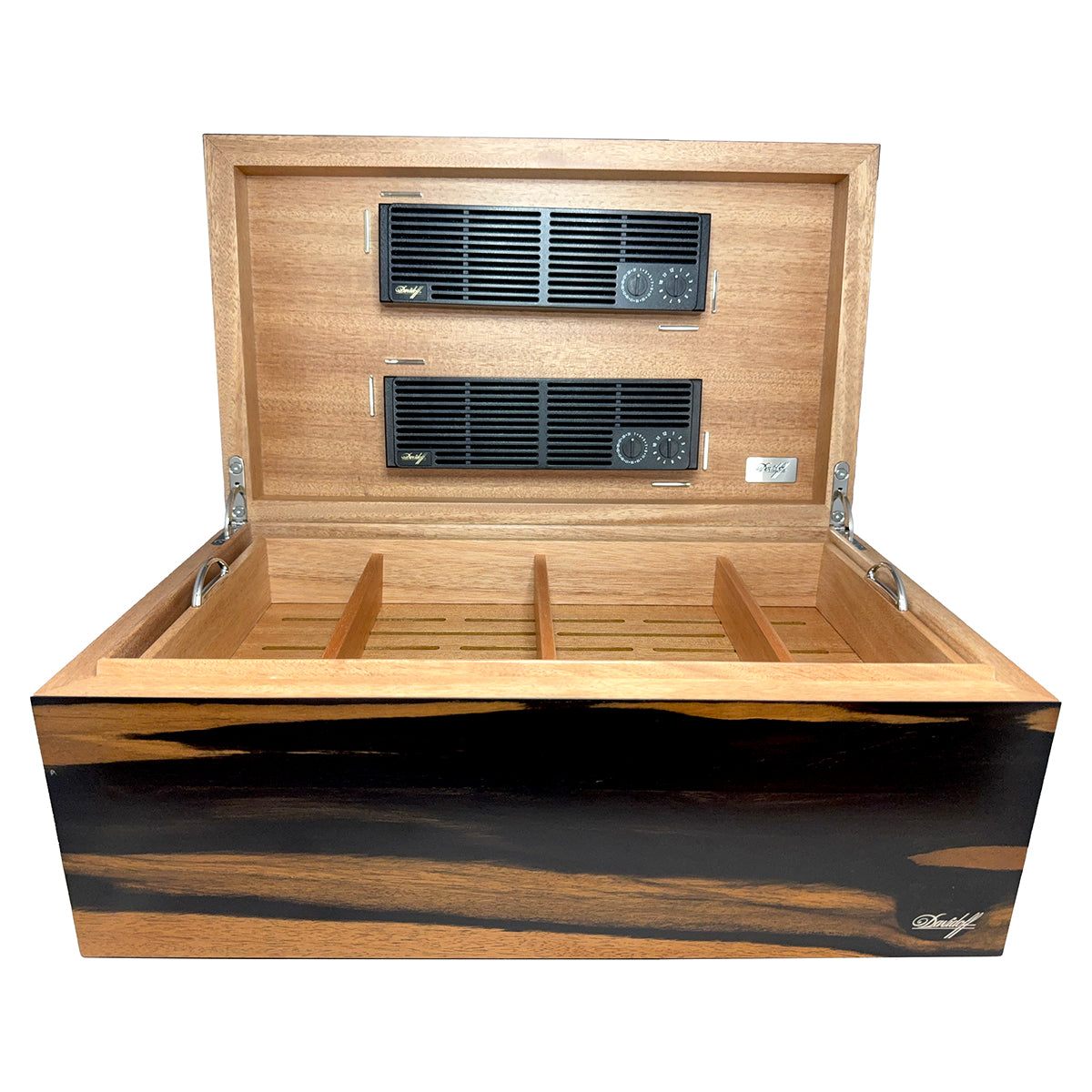 Este humidor exclusivo, confeccionado en ébano de Macassar con un elegante acabado mate, ofrece una estética sobria y contemporánea sin perder la distinción característica de la casa Davidoff. Su interior, revestido en madera de Anigre, garantiza las condiciones ideales para resguardar el carácter de hasta 120 cigarros. Incorpora dos módulos de humidificación autorregulables Davidoff, que mantienen una humedad constante y libre de olores indeseados. Cada componente, desde los divisores ajustables hasta los herrajes de precisión, refleja la excelencia de la artesanía suiza y el compromiso absoluto con la conservación perfecta del tabaco.