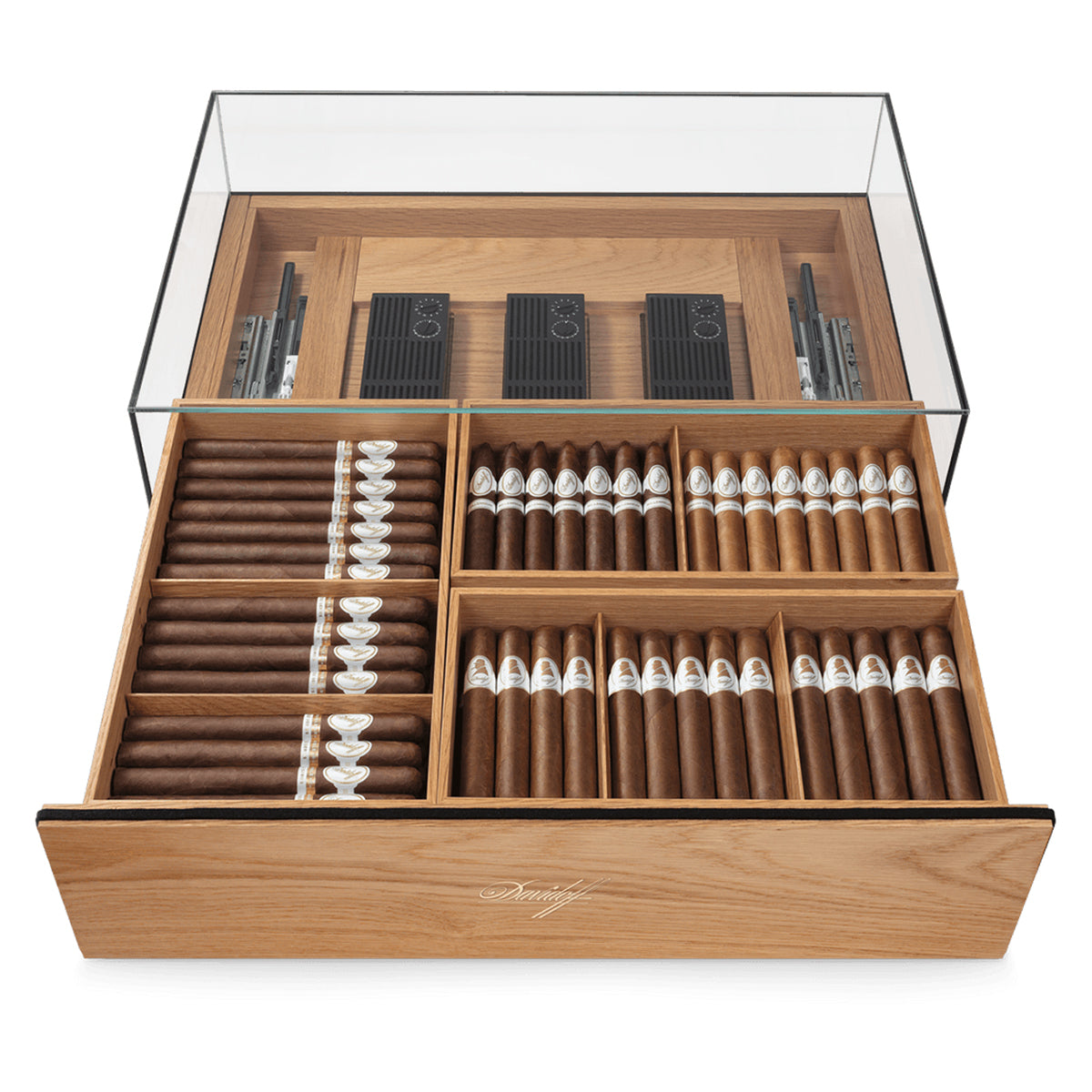 En su interior, incorpora tres bandejas independientes que facilitan la organización de la colección, cada una diseñada para garantizar una circulación uniforme del aire. Equipado con tres reguladores Davidoff deLuxe, mantiene de forma constante un nivel de humedad ideal entre 70 % y 72 %, asegurando que cada cigarro conserve intactas sus propiedades de aroma, sabor y combustión. Gracias a su sistema “push-to-open”, la apertura es fluida y sin necesidad de herrajes visibles, reforzando su carácter minimalista.