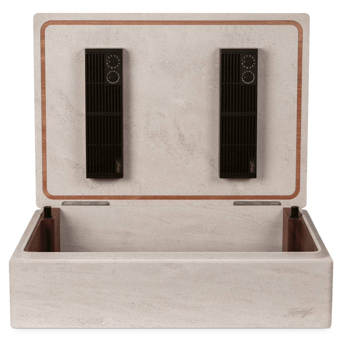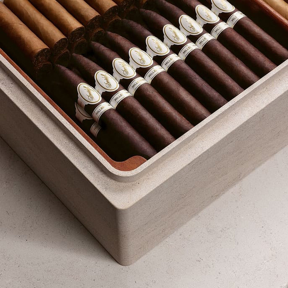 Davidoff Humidor Monolith representa una auténtica obra de arte combinando innovación, materialidad natural y elegancia atemporal. Es el primer humidor de Davidoff tallado completamente a partir de una sola pieza de piedra — piedra caliza “Moca Cream” — lo que lo convierte en un accesorio de lujo pensado para perdurar generaciones.